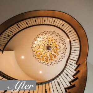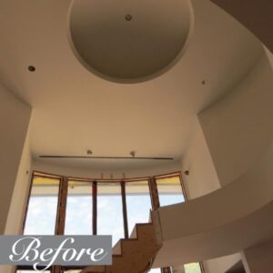 In addition to staining all the doors and window casings throughout the home, Warline also completed custom gold leafing on the main entrance ceilings. Using 24 karat, Italian gold leaf our talented in-house artist, Luke individually applied gold leaf and then buffed the ceiling for a dramatic and stunning effect.